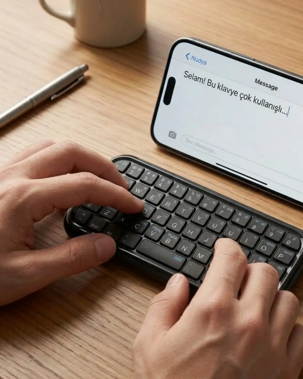 Taşınabilir mini bluetooth klavye, telefon ve tabletlerle pratik yazı yazma deneyimi sunan kompakt bir kablosuz klavyedir. Bluetooth bağlantısı sayesinde cihazınıza hızlı şekilde bağlanarak kablosuz kullanım sağlar. Hafif ve küçük tasarımı sayesinde çantanızda veya cebinizde kolayca taşınabilir. 10 metreye kadar bağlantı mesafesi sayesinde cihazınızı uzaktan kontrol edebilir ve konforlu kullanım sağlayabilirsiniz. USB kablo ile şarj edilebilen dahili bataryası sayesinde tekrar tekrar şarj edilerek kullanılabilir.