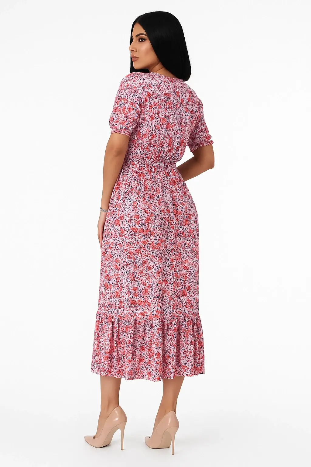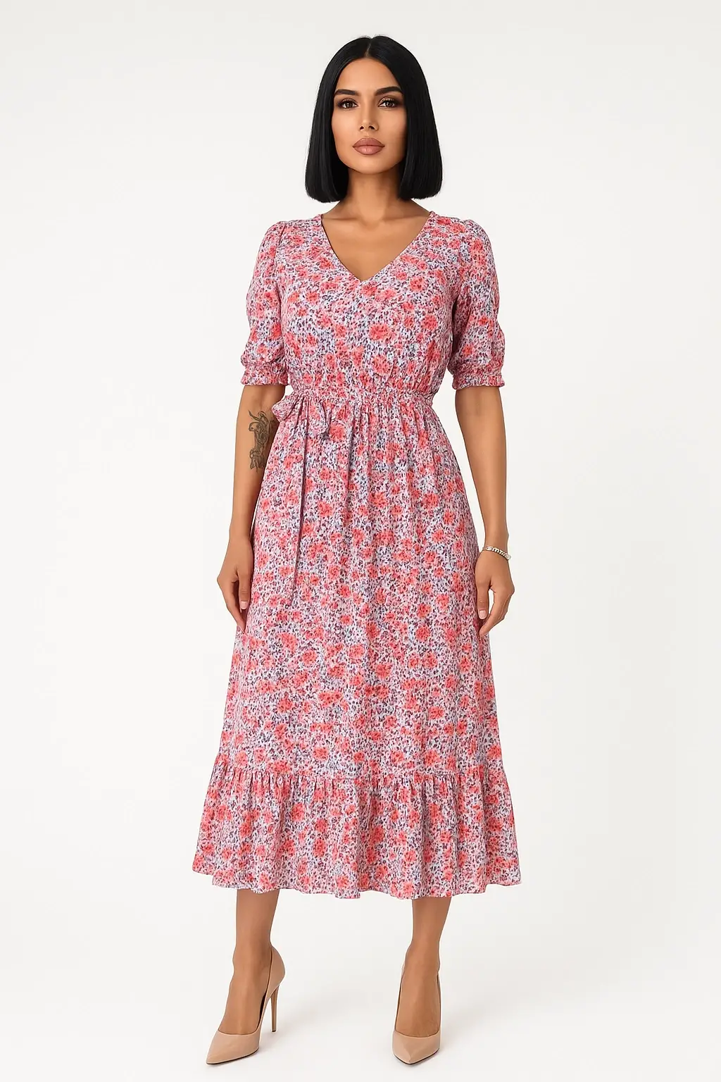 Bu şık elbise, pembe renk tonlarıyla bezenmiş çiçek desenleriyle göz alıyor. Modern ve zarif bir görünüm sunan elbisenin yarattığı estetik, hem günlük kullanımda hem de özel davetlerde harika seçimler yapmanıza olanak tanıyor. Yırtmaç detayı, elbisenin dinamik bir havası olmasını sağlarken, aynı zamanda şıklığınıza da katkıda bulunuyor.