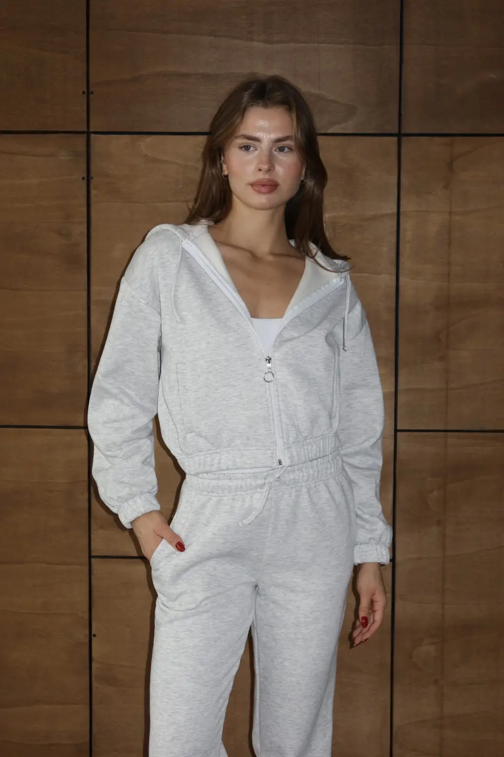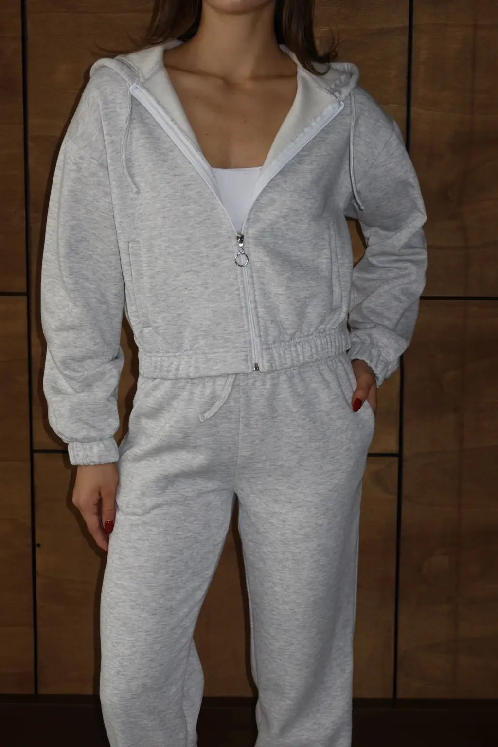 3 iplik şardonlu Kapşonlu fermuarlı kısa üst gri pat8590, kadın giyim koleksiyonuna şıklık ve konfor katıyor.