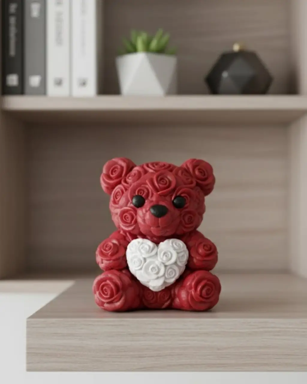 Bu 3D baskı kalp ayıcık, romantik ve şık tasarımıyla özel günlerin vazgeçilmez hediyesi olmaya adaydır. 10 cm boyutuyla minimal ama etkileyici bir dekor sunar. Gül detayları ve kalp figürü ile sevgi temasını estetik biçimde yansıtır.